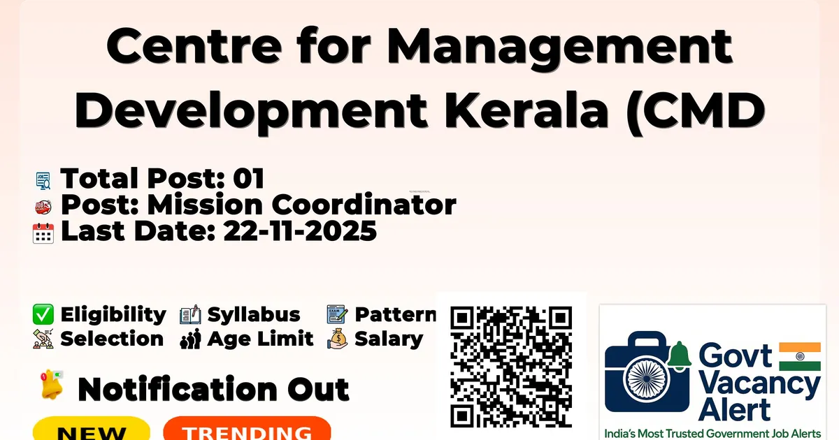 Centre for Management Development Kerala (CMD Kerala) has released an official notification for the recruitment of 01 Mission Coordinator Posts. Interested and eligible candidates can apply Online through the official CMD Kerala website. The last date to submit the application form is 22-11-2025. In this article, you’ll find the CMD Kerala Mission Coordinator Posts recruitment details, including eligibility criteria, age limit, salary structure, selection process, application steps, and direct links to the official notification and Online application form.