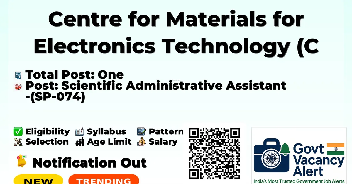 Company Name Centre for Materials for Electronics Technology (C MET) Post Name Scientific Administrative Assistant (SP-074) No of Posts One Advt No CMET/TH/ADM/002/2026 Salary Rs. 24,000/- + HRA per month. Qualification First Class / 60% marks in B.Com./B.A Economics / BSc. Mathematics. Official Website www.cmet.gov.in
