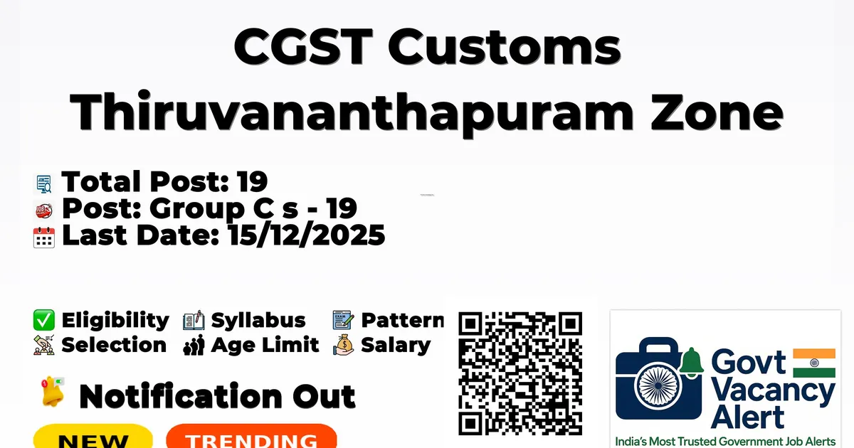 The Office of the Commissioner of Customs (Preventive), Cochin, under the CGST & Customs Thiruvananthapuram Zone, invites applications from eligible Indian National candidates for recruitment to various Group 'C' Non-Gazetted (Non-Ministerial) posts in the Customs Marine Wing. This is an excellent opportunity for experienced candidates in marine and technical trades to join the customs department in Cochin. The CGST Customs Thiruvananthapuram Zone Recruitment 2025-26 application form must be submitted by post. Interested and eligible candidates should carefully read the detailed notification before applying. www.indgovtjobs.in Post Names Tradesman, Seaman, Greaser, Senior Store Keeper Total Vacancies 19 Age Limit 18-25 years (varies by post) Monthly Salary Level 1 to 5 (Rs. 18000 - 92300) Minimum Qualification Matric (10th Pass) / ITI + Relevant Experience Selection Process Merit based on experience & Document Verification Job Location Cochin, Kerala Last Date 15/12/2025 Post Name No of Posts Tradesman 03 Seaman 11 Greaser 04 Senior Store Keeper 01 Post Name Age Limit Tradesman Not more than 25 years Seaman 18 to 25 years Greaser 18 to 25 years Senior Store Keeper Not more than 30 years Age relaxation: SC/ST: 5 years; OBC (NCL): 3 years; Ex-Servicemen: As per rules. Post Name Pay Scale Tradesman Level 2: Rs. 19900 - 63200/- Seaman Level 1: Rs. 18000 - 56900/- Greaser Level 1: Rs. 18000 - 56900/- Senior Store Keeper Level 5: Rs. 29200 - 92300/-