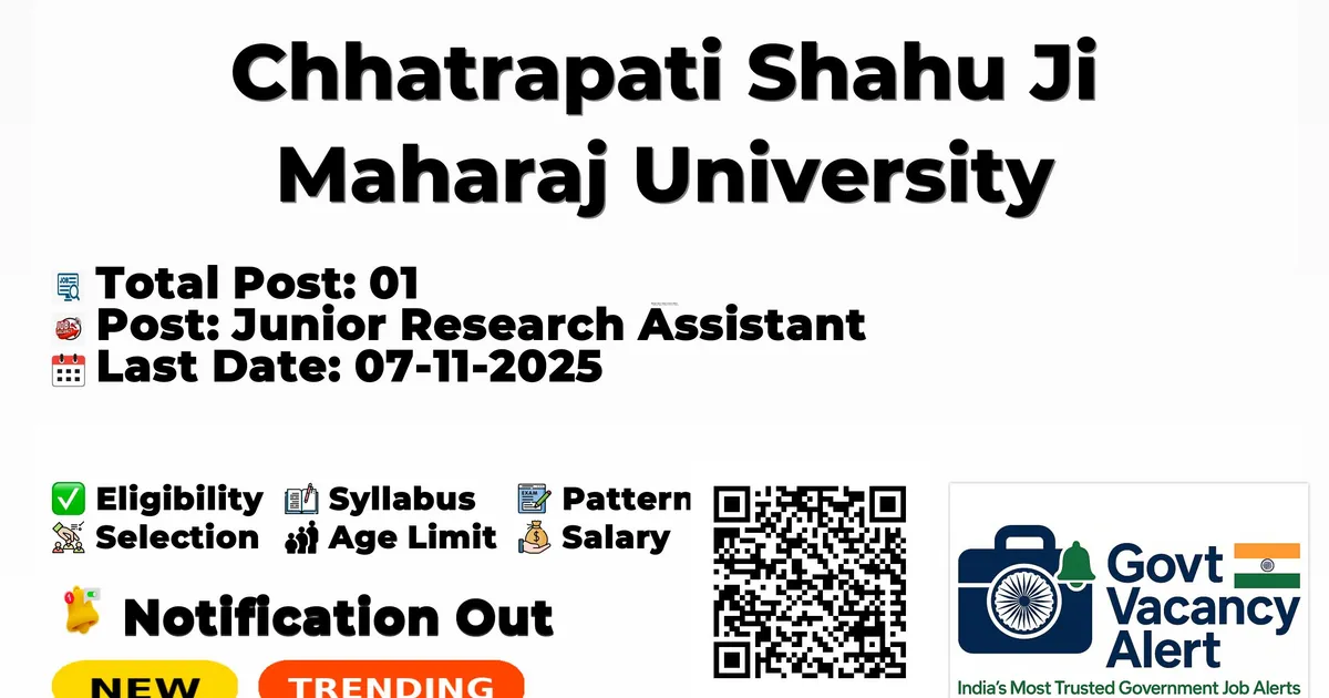 Chhatrapati Shahu Ji Maharaj University (CSJMU) has released an official notification for the recruitment of 01 Junior Research Assistant Posts. Interested and eligible candidates can apply Offline through the official CSJMU website. The last date to submit the application form is 07-11-2025. In this article, you’ll find the CSJMU Junior Research Assistant Posts recruitment details, including eligibility criteria, age limit, salary structure, selection process, application steps, and direct links to the official notification and Offline application form.