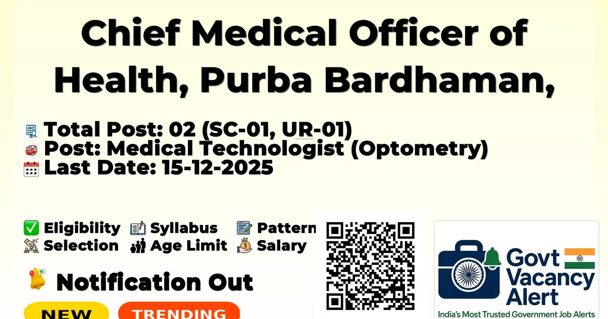 District Health and Family Welfare Samiti Purba Bardhaman (DHFWS Purba Bardhaman) has released an official notification for the recruitment of 02 Medical Technologist Posts. Interested and eligible candidates can apply Online through the official DHFWS Purba Bardhaman website. The last date to submit the application form is 15-12-2025. In this article, you’ll find the DHFWS Purba Bardhaman Medical Technologist Posts recruitment details, including eligibility criteria, age limit, salary structure, selection process, application steps, and direct links to the official notification and Online application form. Join Arattai Channel Trending Govt Jobs SSC 25487 GD Constable Online Form 2025 OICL 300 AO Online Form 2025 RRB NTPC 12TH Level Online Form 2025 3058 Post Intelligence Bureau (IB) 362 MTS Online Form 2025 RRB 2569 JE (Junior Engineer) Online Form 2025 Advertisement Company Name Chief Medical Officer of Health, Purba Bardhaman, District Health and Family Welfare Samiti Purba Bardhaman (West Bengal) Post Name Medical Technologist (Optometry) No of Posts 02 (SC-01, UR-01) Salary Rs. 1,000/- per day for 3 days in a week (Consolidated) Qualification H.S (10+2) with Physics, Chemistry, Biology + 2 years Diploma/Bachelor in Optometry Age Limit 21–32 years (as on 01-01-2025) Start Date for Apply 02-12-2025 Last Date for Apply 15-12-2025 Official Website https://wbhealth.gov.in S.No. Post Name Total Vacancies 1 Medical Technologist (Optometry) – Chokher Alo Programme 02 (SC-01, UR-01) Passed H.S (10+2) Examination or its equivalent with Physics, Chemistry, Biology and a two years Diploma course in Optometry / Bachelor Degree in Medical Technology (Optometry) from any recognized institution of West Bengal Must be permanent resident of West Bengal Knowledge of local language (Bengali) is required Consolidated Remuneration: Rs. 1,000/- per day for maximum 3 days in a week Contractual position under “Chokher Alo” Programme Minimum Age: 21 years Maximum Age: 32 years Age relaxation applicable as per existing Government norms Academic Qualification Marks (Maximum 85 marks) Working Experience Marks (Maximum 10 marks) Interview (15 marks) Total: 100 marks Apply online only through the official website: https://wbhealth.gov.in → Online Recruitment Fill up the application form carefully and upload all required documents in prescribed format Last date for submission of online application: 15-12-2025 Print copy of online application along with self-attested documents to be produced at the time of verification Incomplete/incorrect applications will be rejected Event Date Notification Date 02-12-2025 Last Date to Apply Online 15-12-2025 Official Notification PDF: Click here Official Website: Click here Join Arattai Channel: Click Here Join Telegram Channel: Click Here Join WhatsApp Channel: Click Here Sarkari Result Vacancy: Click Here Download Mobile App: Click Here Jobs In West Bengal Alipurduar Asansol Bankura Barddhaman Birbhum Burdwan Dakshin Dinajpur Darjiling Durgapur Haldia Howrah Hugli Jalpaiguri Jhargram Kharagpur Koch Bihar Kolkata Malda Midnapur Murshidabad Nadia North Twenty Four Parganas Paschim Medinipur Purba Medinipur Puruliya Raniganj Siliguri South Twenty Four Parganas Uttar Dinajpur Also Read Territorial Army Rally Recruitment 2025 - 1500+ Vacancies - 8TH, 10TH, 12TH Pass Candidates Can Apply AIIMS CRE Recruitment 2025 - 1300+ Group B and Group C Posts - Apply Link Click Here RRB Recruitment 2025 - 2500+ JE (Junior Engineer) Vacancies - 35400 Monthly Salary - Apply Now Jobs By Education 10TH Jobs› 8TH Jobs› 12TH Jobs› Diploma Jobs› ITI Jobs› B.Tech/B.E Jobs› B.com Jobs› Any Graduate Jobs› Any Post Graduate Jobs› Maharashtra 15631 Police Constable Online Form 2025 SBI 996 SCO Online Form 2025 EMRS Teaching and NonTeaching Admit Card 2025 SSC 25487 GD Constable Online Form 2025 IBPS RRB Clerk Admit Card 2025 RRB Group D Admit Card 2025 Delhi Police Head Constable (Ministerial) Admit Card 2025 IOCL 2,756 Apprentices Online Form 2025 RRB NTPC 12TH Level Online Form 2025 3058 Post 1. What is the post name? Ans: Medical Technologist (Optometry) – Chokher Alo Programme 2. How many vacancies are there? Ans: Total 02 posts (SC-01, UR-01) 3. What is the remuneration? Ans: Rs. 1,000/- per day for maximum 3 days in a week 4. What is the age limit? Ans: 21 to 32 years as on 01-01-2025 5. What is the last date to apply? Ans: 15-12-2025 6. Is this a permanent job? Ans: No, it is purely contractual under Chokher Alo Programme 7. What is the required qualification? Ans: H.S + 2 years Diploma or Bachelor in Optometry