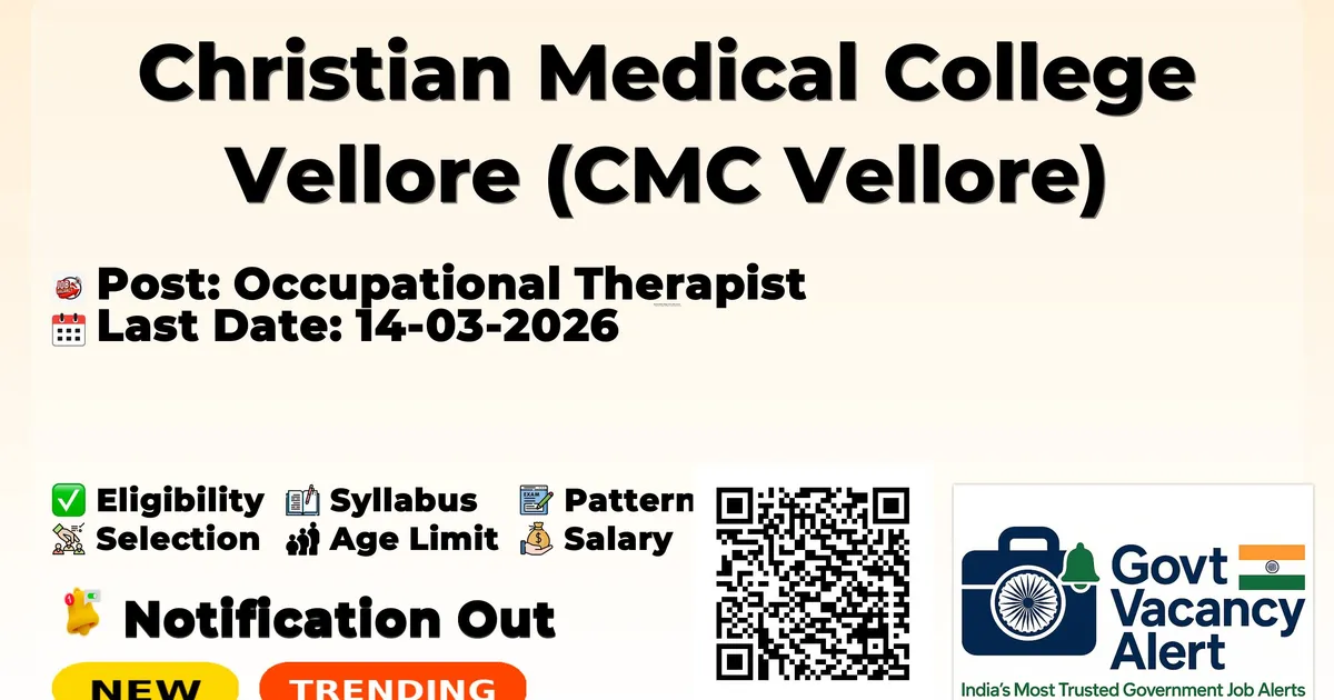 Christian Medical College Vellore (CMC Vellore) has released an official notification for the recruitment of Occupational Therapist Posts. Interested and eligible candidates can apply Online through the official CMC Vellore website. The last date to submit the application form is 14-03-2026. In this article, you’ll find the CMC Vellore Occupational Therapist Posts recruitment details, including eligibility criteria, age limit, salary structure, selection process, application steps, and direct links to the official notification and Online application form.