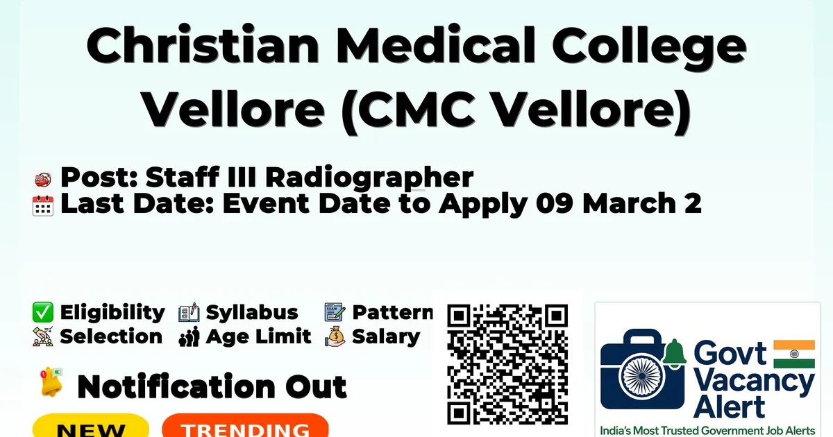 Company Name Christian Medical College Vellore (CMC Vellore) Post Name Staff III Radiographer Salary As per Institute rules Qualification M.Sc with two year Diploma in Medical Radiodiagnosis Technology, B.Sc Age Limit Max: 25 years Last Date 09 March 2026 Apply Mode Online Job Type Full Time