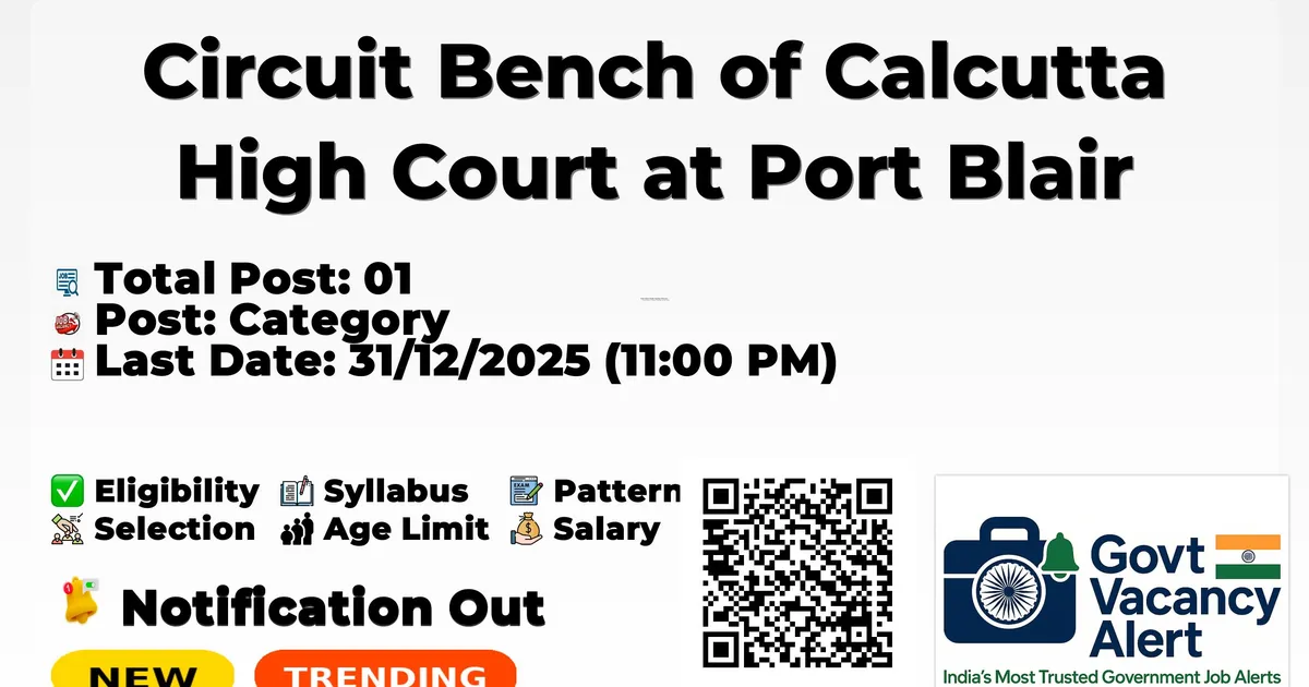 Company Name Circuit Bench of Calcutta High Court at Port Blair Post Name Stenographer/P.A. No of Posts 01 Salary Pay Matrix Level-09 (Rs.28,900 – 74,500) with Minimum Pay of Rs.32,500/- + other allowances Per Month Qualification Senior Secondary/Higher Secondary or equivalent + Speed in Shorthand @120 wpm and Typewriting @30 wpm (Desirable: Working knowledge in Computer) Age Limit 18 – 30 years (as on date of application) Start Date for Apply 01/12/2025 (05:00 PM) Last Date for Apply 31/12/2025 (11:00 PM) Official Website https://www.calcuttahighcourt.gov.in