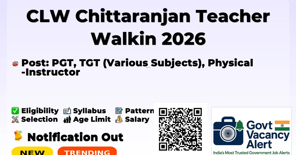 Particulars Details Recruitment Name CLW Chittaranjan Contractual Teacher (PGT/TGT/Physical Instructor) Recruitment 2026 Department Chittaranjan Locomotive Works (CLW), Indian Railways Post Names PGT, TGT (Various Subjects), Physical Instructor Notification No. GMA/School/G/Contractual TCR(1) Nature of Engagement Purely Contractual and Part-time basis Remuneration PGT – Rs.27,500/month; TGT – Rs.26,250/month; Physical Instructor – Rs.26,250/month Age Limit Minimum 18 years; Maximum 65 years as on date of notification Application Mode Walk-in-Interview (Offline) Application Fee Not Mentioned Venue Hindi Library/GM Office Building, CLW/Chittaranjan, Distt: Paschim Bardhaman, WB-713331 Walk-in-Interview Start Date 09 April 2026 Notification Date 26 March 2026