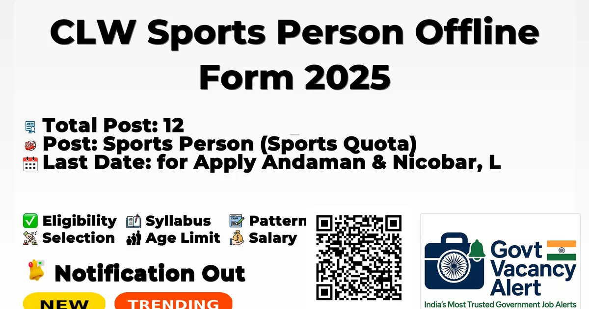 The Chittaranjan Locomotive Works (CLW) Recruitment 2025 for 12 posts of Sports Person. Candidates with Any Graduate, 12TH, 10TH Can Apply Offline. The Offline application opens on 29-08-2025, and closes on 23-09-2025. The candidate shall apply Offline through CLW website, indianrailways.gov.in.