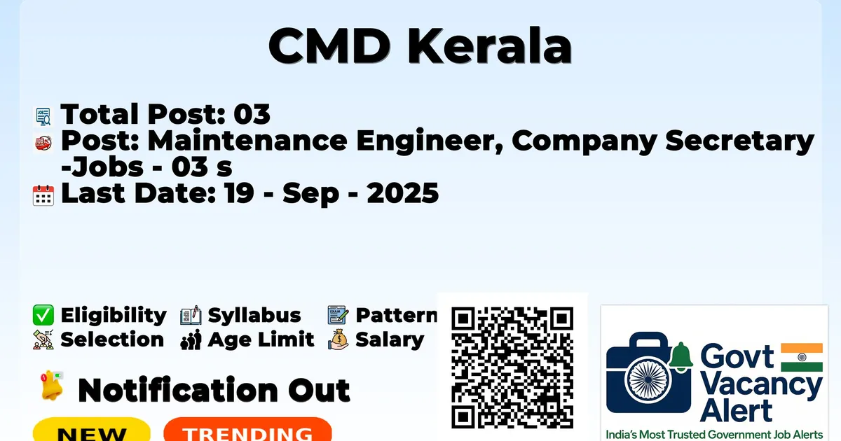 Centre for Management Development Kerala (CMD Kerala) has declared the official notification for 2025. To fill up the vacancies for 03 Maintenance Engineers, Company Secretary Jobs. Those candidates who have qualified in Any Degree, CA, can grab this chance and apply for the CMD Kerala Recruitment 2025. Here we include the age limit, Selection process, salary structure, education details, application fee, and how to apply for these posts. Interested and eligible candidates can apply on or before the last date of application. For more details, visit the official website.