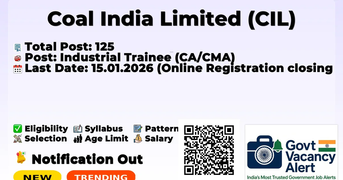 Coal India has released an official notification for the recruitment of 125 Industrial Trainee Posts. Interested and eligible candidates can apply Online through the official Coal India website. The last date to submit the application form is 15-01-2026. In this article, you’ll find the Coal India Industrial Trainee Posts recruitment details, including eligibility criteria, age limit, salary structure, selection process, application steps, and direct links to the official notification and Online application form.