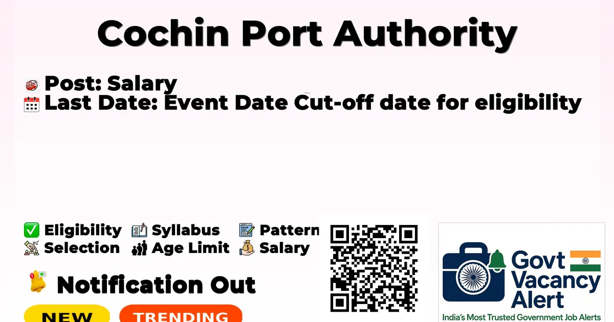 Cochin Port Authority has released an official notification for the recruitment of 05 Senior Project Consultants, Project Consultants Posts. Interested and eligible candidates can apply Online through the official Cochin Port Authority website. The last date to submit the application form is 10-03-2026. In this article, you’ll find the Cochin Port Authority Senior Project Consultants, Project Consultants Posts recruitment details, including eligibility criteria, age limit, salary structure, selection process, application steps, and direct links to the official notification and Online application form.