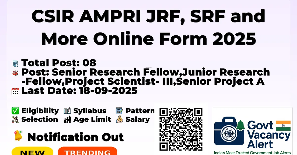 The Advanced Materials and Processes Research Institute (CSIR AMPRI) Recruitment 2025 for 08 posts of JRF, SRF and More. Candidates with B.Tech/B.E, M.Sc, M.E/M.Tech, M.Phil/Ph.D Can Apply Online. The online application opens on 04-09-2025, and closes on 18-09-2025. The candidate shall apply online through CSIR AMPRI website, ampri.res.in. The CSIR AMPRI JRF, SRF and More Recruitment 2025 Notification PDF has been released on 12-09-2025 at ampri.res.in. Check the complete job details, vacancy, age limit, application fee, selection process and how to apply from the article. You can Check all Latest Sarkari Result Updates of All Central Government Jobs and State Government Jobs. CSIR AMPRI JRF, SRF and More Recruitment 2025 Notification PDF