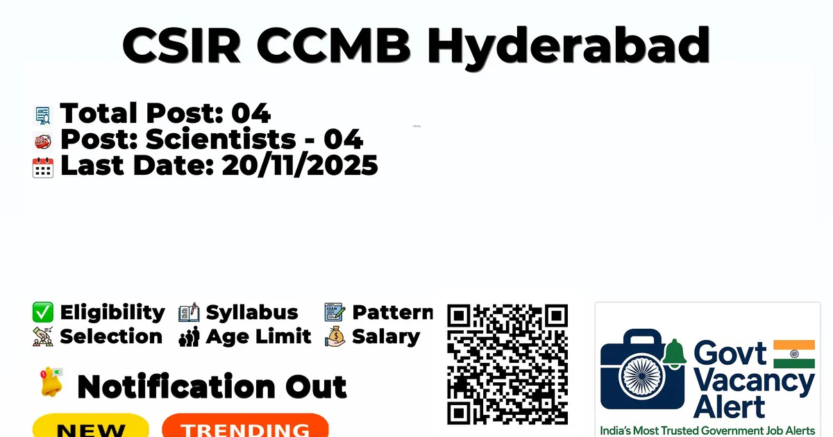 The CSIR-CCMB Hyderabad Scientist Recruitment 2025 online applications will commence from 29th October 2025. Eligible candidates are advised to read the detailed notification carefully before applying. The last date for online registration is 20th November 2025, with hardcopy submission required by 28th November 2025.