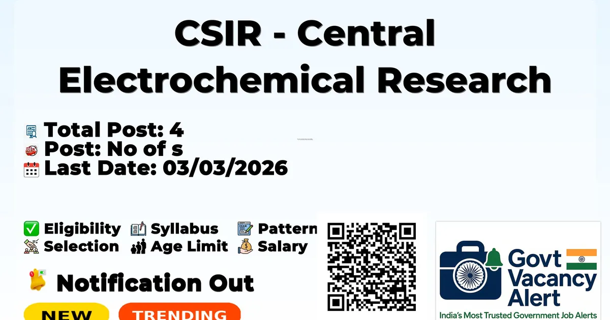 Central Electrochemical Research Institute (CECRI) has released an official notification for the recruitment of 04 Senior Project Associate, Project Assistant and Other Posts. Interested and eligible candidates can apply Online through the official CECRI website. The last date to submit the application form is 03-03-2026. In this article, you’ll find the CECRI Senior Project Associate, Project Assistant and Other Posts recruitment details, including eligibility criteria, age limit, salary structure, selection process, application steps, and direct links to the official notification and Online application form.