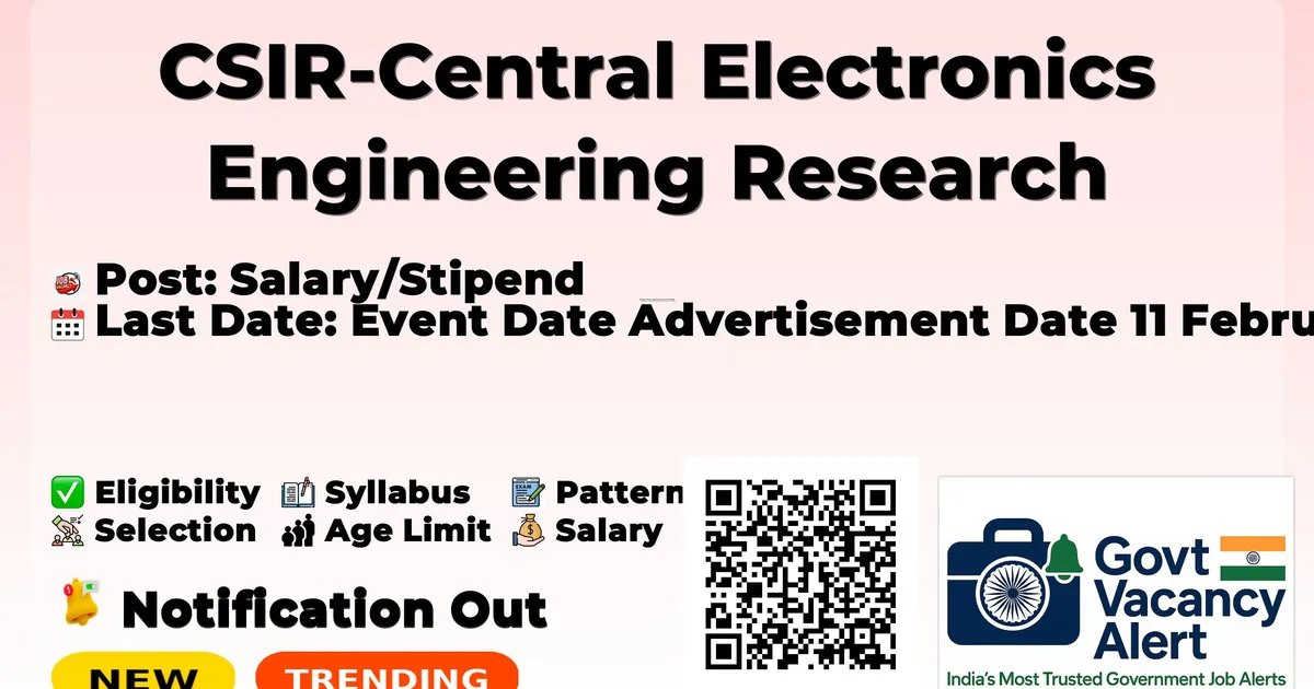 Company Name CSIR-Central Electronics Engineering Research Institute (CSIR-CEERI) Post Name Project Assistant, Project Associate, and More Number of Posts 16 Advertisement Number PF-02/2026 Salary Rs. 18,000/- to Rs. 57,000/- per month (fixed) depending on post and qualification Qualification B.E/B.Tech in Electronics/ECE/EEE, M.Sc in Physics/Electronics, M.Tech, M.E, 10th + ITI, Post-Graduate degrees Age Limit 30-50 years with relaxation of 5 years for SC/ST/PwD/Women and 3 years for OBC Notification Date 11-02-2026 Last Date to Apply 26-02-2026 Apply Mode Online Job Type Temporary
