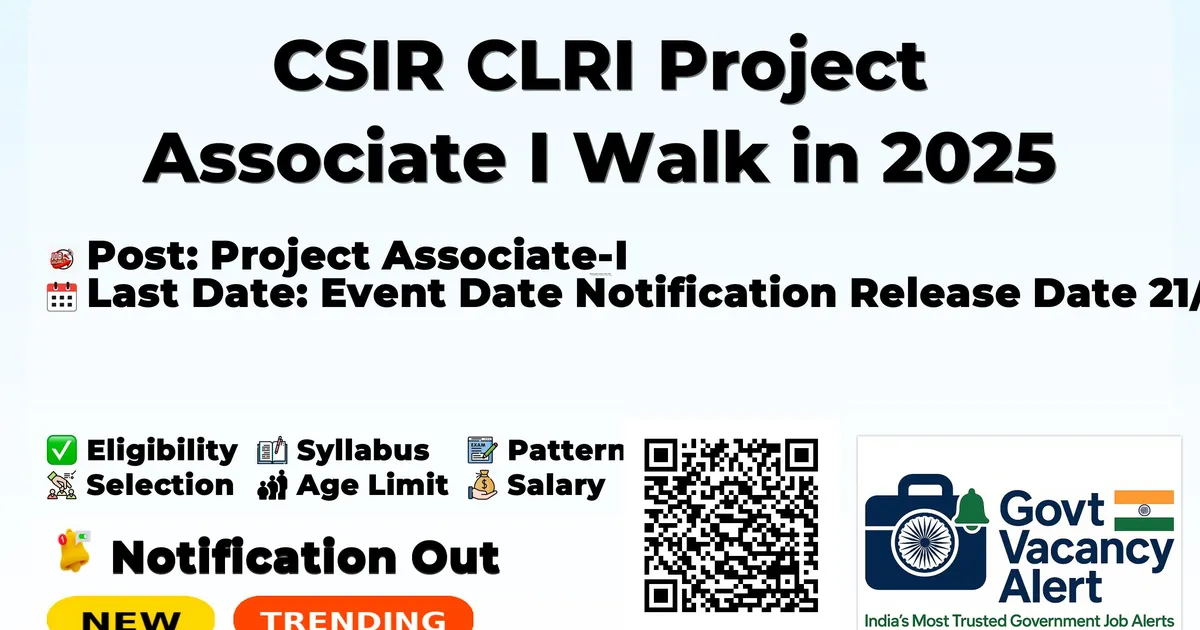 Details Information Organization Name CSIR CENTRAL LEATHER RESEARCH INSTITUTE (CSIR-CLRI) Post Name Project Associate-I Total Vacancies 2 Posts Salary/Pay Scale Rs. 25,000/- to Rs. 31,000/- plus HRA as per organization norms (Check official notification) Educational Qualification 1. M.Sc. in Chemistry, Physics, Biochemistry, Biophysics or B.Tech in Leather Technology/Footwear Technology (Position 1) 2. B.Tech/B.Des in Leather/Textile/Leather Design/Accessories Design/Fashion Design or equivalent (Position 2) Age Limit Maximum 35 years (Age relaxation applicable as per Govt. rules: 05 years for SC/ST/PwBD/Women, 03 years for OBC) Application Start Date 21/11/2025 Application End Date 11/12/2025 Application Mode Walk-in Interview (Candidates to attend with application form and documents) Official Website https://clri.org/CareersForms.aspx