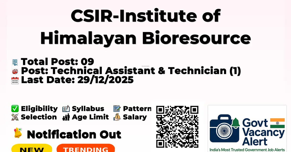 Company Name CSIR-Institute of Himalayan Bioresource Technology (CSIR-IHBT) Post Name Technical Assistant & Technician (1) No of Posts 09 Salary ₹19,900/- to ₹35,400/- (Level 2/6) + Allowances Qualification B.Sc. / Diploma / SSC + ITI Age Limit Maximum 28 Years Start Date for Apply 29/11/2025 Last Date for Apply 29/12/2025 Official Website https://ihbt.res.in