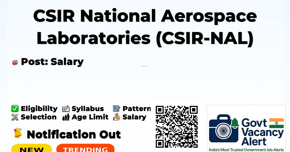 Company Name CSIR National Aerospace Laboratories (CSIR-NAL) Post Name Project Staff Number of Posts 5 Advertisement Number 05/2026/PS Salary ₹25,000/- + HRA to ₹42,000/- + HRA Qualification Bachelor's degree in Engineering or Technology in relevant fields (some positions require Masters/Integrated Masters and NET/GATE) Age Limit Up to 35 and 40 years, with relaxations for SC/ST/OBC/Women/PWD Notification Date 18 February 2026 Walk-in Interview Date 25 February 2026 to 26 February 2026 Apply Mode Walk-in Job Type Project-based