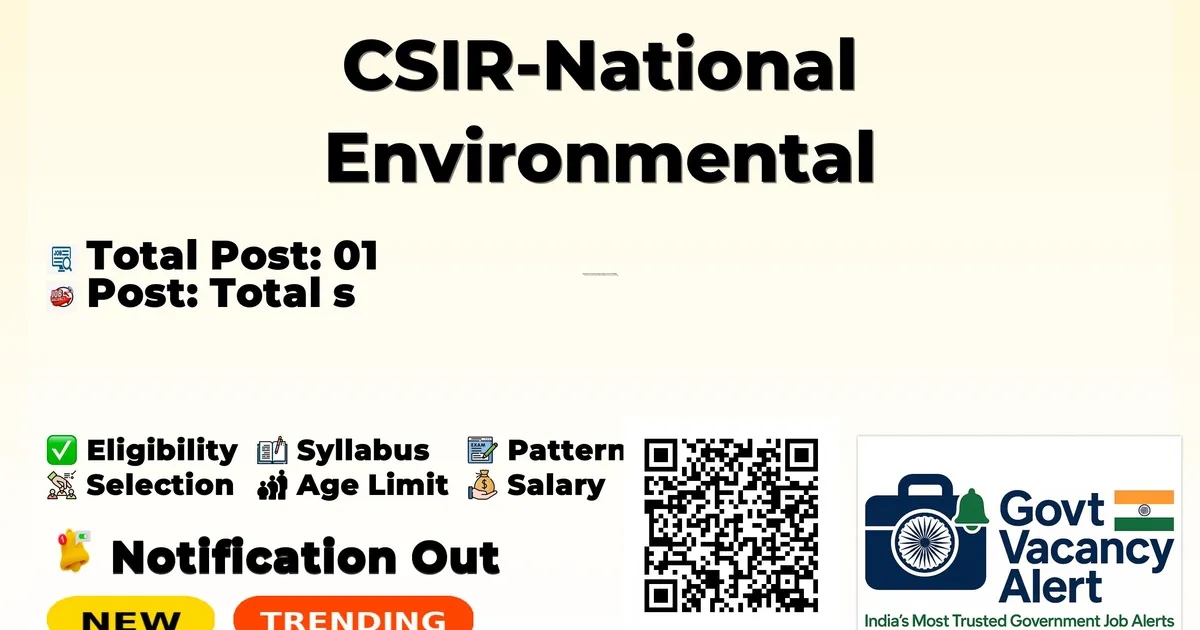 Company Name CSIR-National Environmental Engineering Research Institute (CSIR-NEERI) Post Name Senior Project Associate No of Posts 01 Advt No RECRUIT_V1_1B_WR_19022026 Salary Rs. 42,000/- + HRA Per Month Qualification B.E./B.Tech in Civil Engineering or Technology + 3 years experience Age Limit Maximum Age: 40 years Notification Date 19-02-2026 Walk-in Date 02-03-2026 Official Website www.neeri.res.in