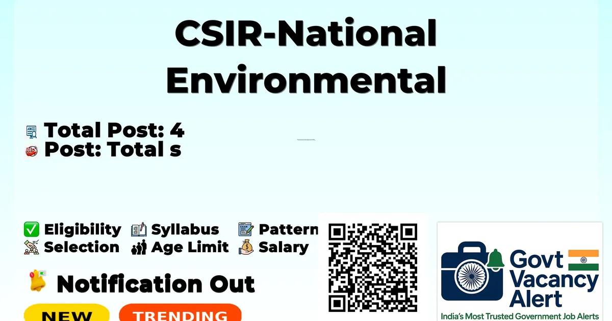 CSIR-National Environmental Engineering Research Institute (CSIR-NEERI) Recruitment 2026: CSIR-National Environmental Engineering Research Institute is conducting a Walk-in Interview for 4 Project Assistant, Project Associate posts. This recruitment provides an excellent opportunity for eligible candidates to attend the interview directly without any prior online application.