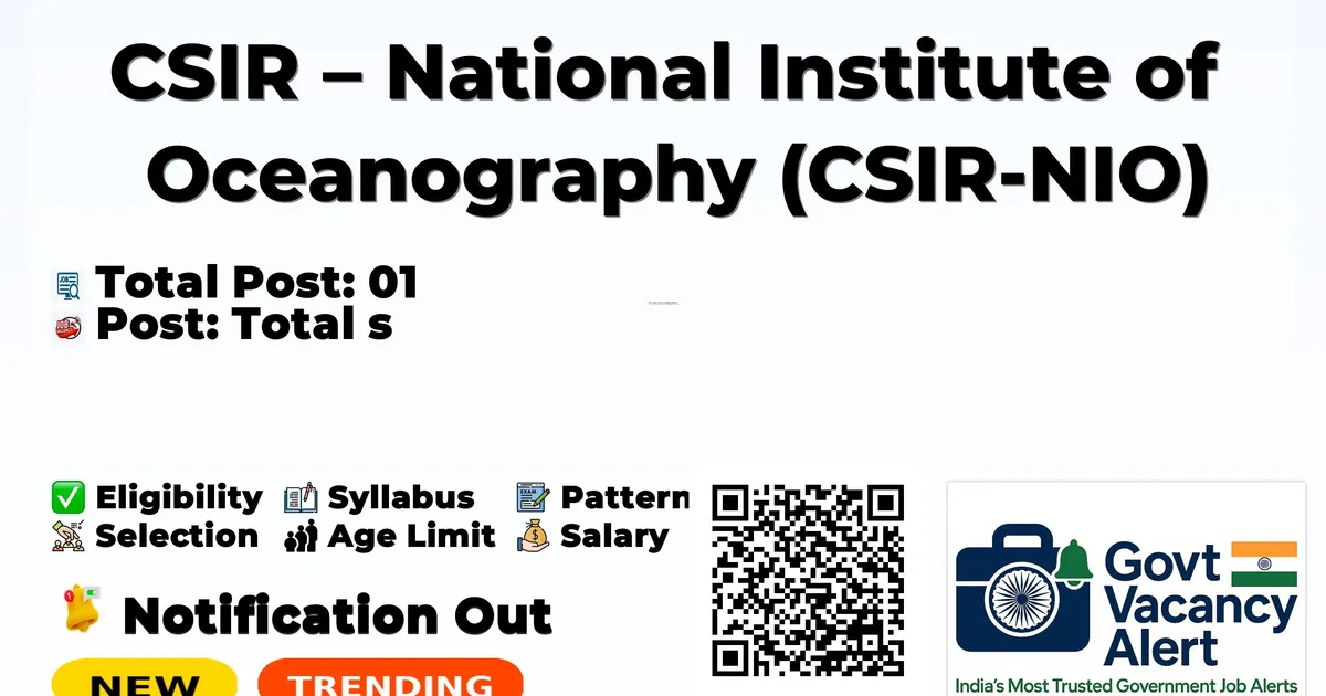 Company Name CSIR – National Institute of Oceanography (CSIR-NIO) Post Name Part Time Medical Officer (Allopathic System) No of Posts 01 Salary Rs.46,020/- (Rupees Forty-Six Thousand and Twenty Only) per month for performing 03 hours duty per day. Qualification MBBS degree from recognized University/ Institute Age Limit to 70 years Walkin 11/12/2025 Official Website https://www.nio.res.in