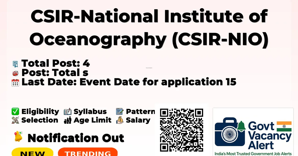 CSIR-National Institute of Oceanography (CSIR-NIO) has officially released a notification for the recruitment of 4 Project Associate Posts. This recruitment drive offers a great opportunity for candidates looking for government jobs. Interested and eligible candidates can apply online through the official website.The last date to apply online is 15-03-2026, so applicants are advised to submit their forms well before the deadline to avoid last-minute issues.