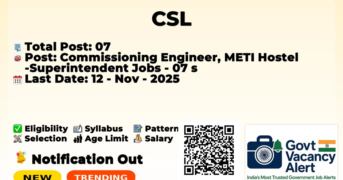 The Cochin Shipyard Limited (CSL) has officially released the notification to fill the vacancies of 07 Commissioning Engineer and METI Hostel Superintendent Wardens Posts. Interested and eligibile candidates can use this opportunity to apply for these posts before the last date of application. Candidates who have completed their 10th, Diploma in Electrical, Electronics, and Mechanical Engineering can apply for the CSL Notification 2025. The interested applicants can apply in online mode. Here we have mentioned the education details, age limit, selection process, application fee, salary, and how to apply for these posts before the deadline. The application dates have already begun.