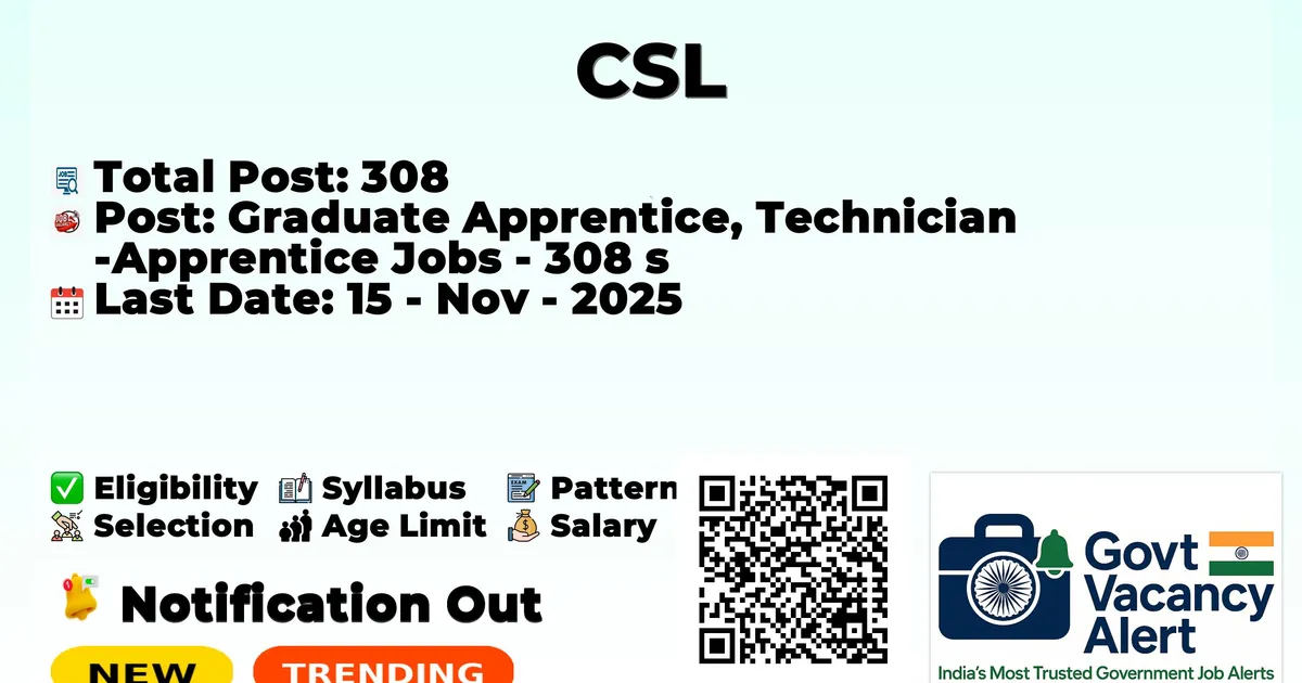 The Cochin Shipyard Limited (CSL) has officially released the notification to fill the vacancies of 308 Graduate Apprentice and Technician Apprentice Posts. Interested and eligibile candidates can use this opportunity to apply for these posts before the last date of application. Candidates who have completed their 10th, ITI, and 12th can apply for the CSL Notification 2025. The interested applicants can apply in online mode. Here we have mentioned the education details, age limit, selection process, application fee, salary, and how to apply for these posts before the deadline. The application dates have already begun.
