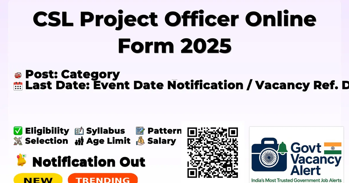 Cochin Shipyard (CSL) has released an official notification for the recruitment of 04 Project Officer Posts. Interested and eligible candidates can apply Online through the official CSL website. The last date to submit the application form is 24-12-2025. In this article, you’ll find the CSL Project Officer Posts recruitment details, including eligibility criteria, age limit, salary structure, selection process, application steps, and direct links to the official notification and Online application form.