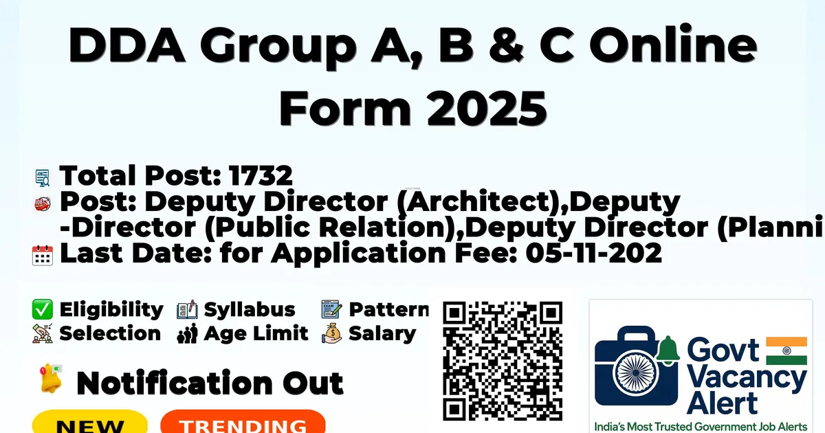The Delhi Development Authority (DDA) Recruitment 2025 for 1732 posts of Group A, B & C. Candidates with Any Graduate Can Apply Online. The online application opens on 06-10-2025, and closes on 05-11-2025. The candidate shall apply online through DDA website, dda.gov.in.