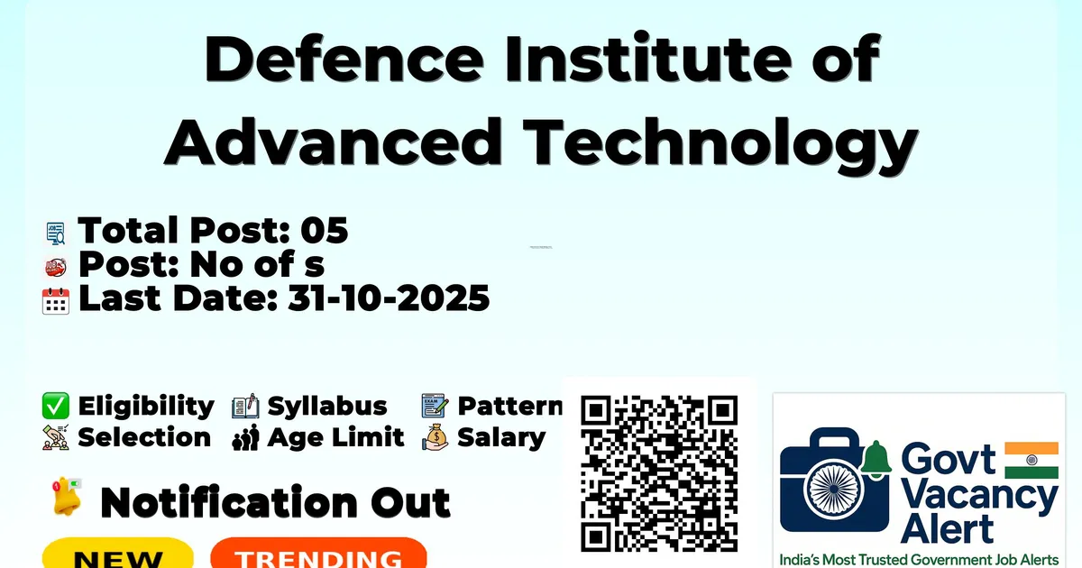 Company Name Defence Institute of Advanced Technology (DIAT) Post Name SRF, Research Associate and More No of Posts 05 Pay Matrix Rs.20,000 - 67,000 Qualification Bachelors Degree, B.Tech/ B.E, M.Sc, M.E/M.Tech, M.Phil/Ph.D Age Limit 35 years Start Date for Apply 23-10-2025 Last Date for Apply 31-10-2025 Official Website drdo.gov.in