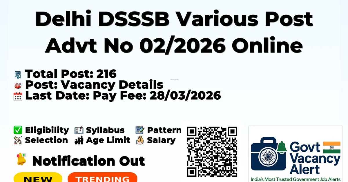 Those Candidate Who Are Interested in DSSSB Various Post Advt No 02/2026 Recruitment & Complete all Eligibility Criteria and want to appear in this recruitment can apply online from 27 February 2026 to 28 March 2026. Read the full notification before apply online.