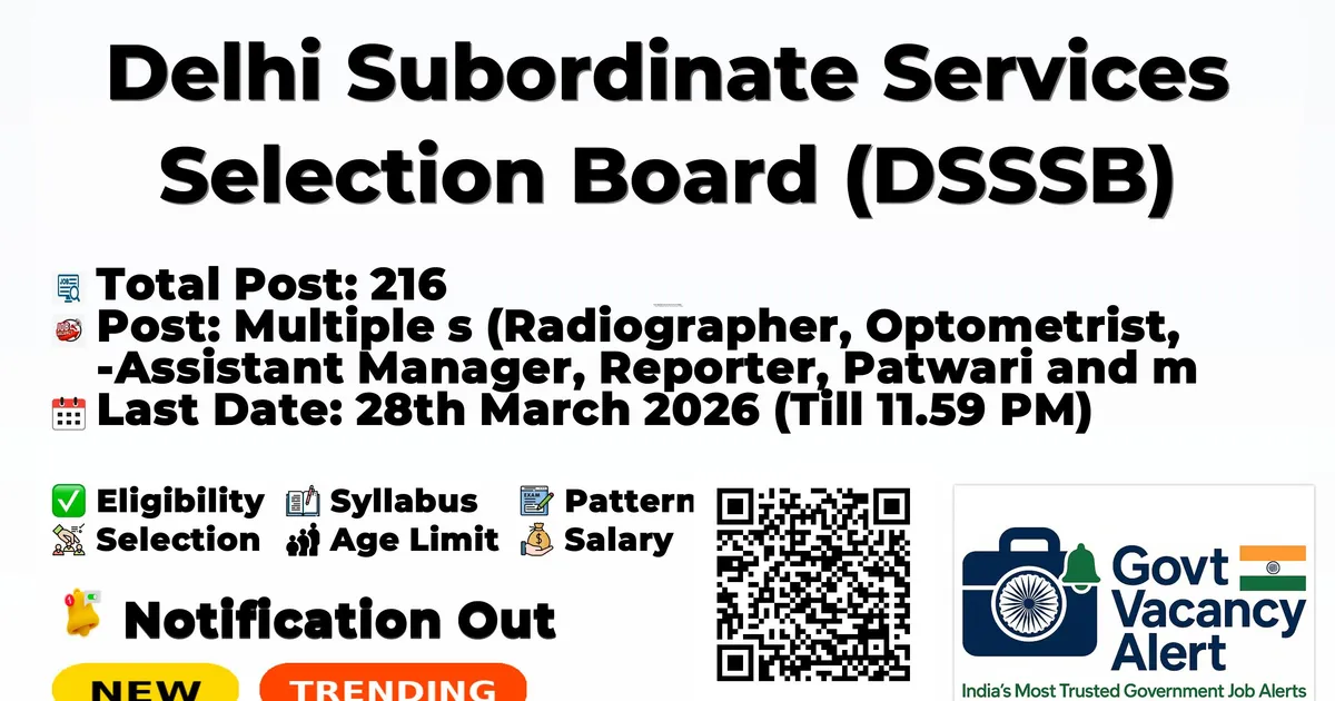 Company Name Delhi Subordinate Services Selection Board (DSSSB) Post Name Multiple Posts (Radiographer, Optometrist, Assistant Manager, Reporter, Patwari and more) No of Posts 216 Advt No 02/2026 Salary ₹18,000 – ₹1,51,100/- Per Month (Pay Scale; varies by post) Qualification Matric / 10+2 / ITI / Diploma / Graduation / Post Graduation (varies by post) Age Limit 18 to 32 years (varies by post) Start Date for Apply 27th February 2026 (From 12.00 Noon) Last Date for Apply 28th March 2026 (Till 11.59 PM) Official Website https://dsssb.delhi.gov.in