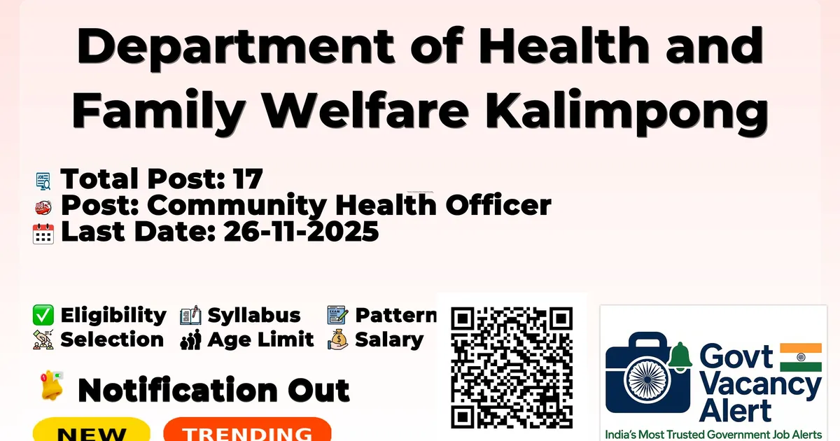 Company Name Department of Health and Family Welfare Kalimpong (DHFW Kalimpong) Post Name Community Health Officer No of Posts 17 Salary Rs. 20000 Qualification B.Sc Start Date for Apply Online 10-11-2025 Last Date for Apply Online 26-11-2025 Official Website kalimpong.gov.in