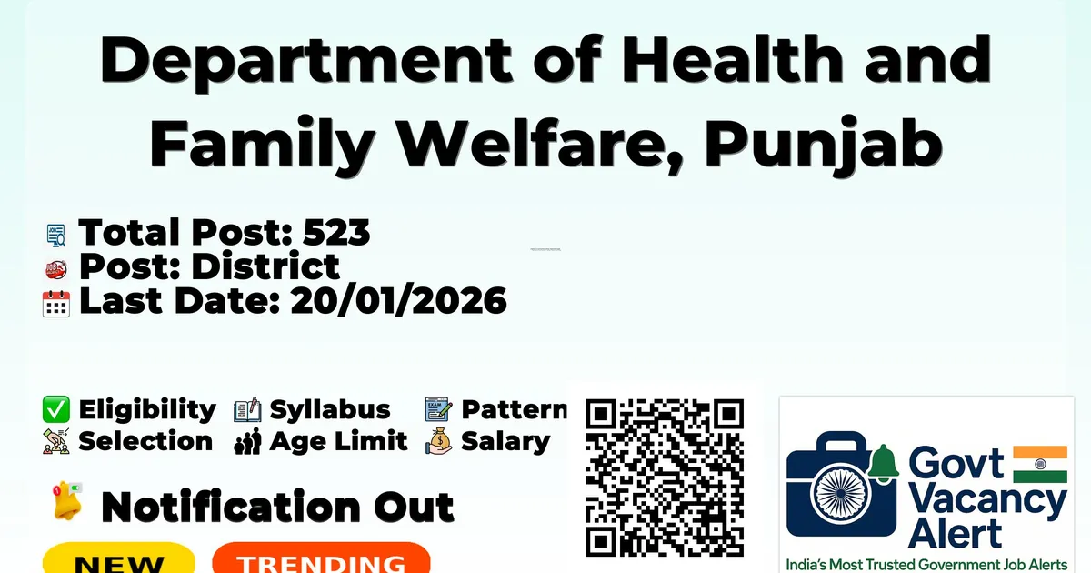Company Name Department of Health and Family Welfare, Punjab (DHFW Punjab) Post Name House Surgeon No of Posts 523 Advt No E4(4)/Pb./2026/180 Salary Rs 70,000/- Qualification MBBS with internship completion on or before 31.12.2025 Start Date for Apply 10/01/2026 Last Date for Apply 20/01/2026 Official Website nhm.punjab.gov.in