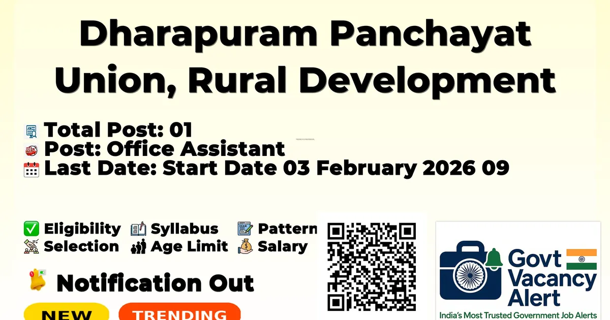 Company Name Dharapuram Panchayat Union, Rural Development and Panchayat Raj Department, Tiruppur District Post Name Office Assistant No of Posts 01 Salary Rs.15700-Rs.58100/- (Level-1) + other steps as determined by the government Qualification 8th grade pass, Pithilandi, Ottatterindavar Age Limit 18 to 32/34/37 years (as per category) Start Date 03 February 2026 Last Date 09 February 2026 Official Website www.tiruppur.tn.nic.in