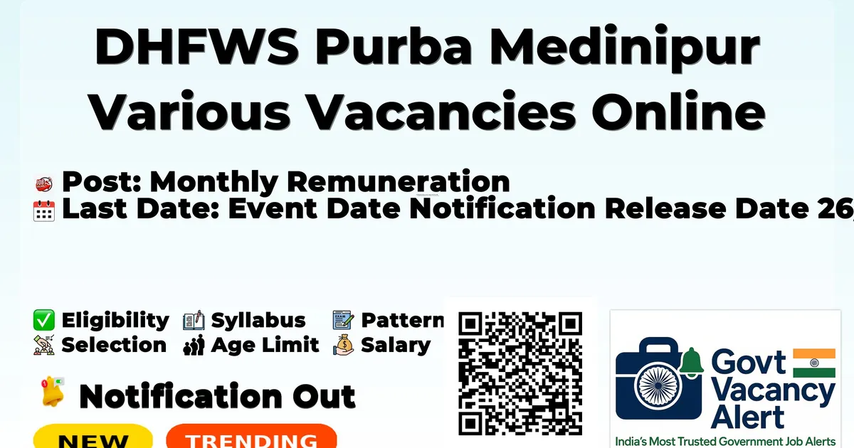 District Health and Family Welfare Samiti Purba Medinipur (DHFWS Purba Medinipur) has released an official notification for the recruitment of 59 Staff Nurse, Medical Officer and Other Posts. Interested and eligible candidates can apply Online through the official DHFWS Purba Medinipur website. The last date to submit the application form is 12-12-2025. In this article, you’ll find the DHFWS Purba Medinipur Staff Nurse, Medical Officer and Other Posts recruitment details, including eligibility criteria, age limit, salary structure, selection process, application steps, and direct links to the official notification and Online application form.