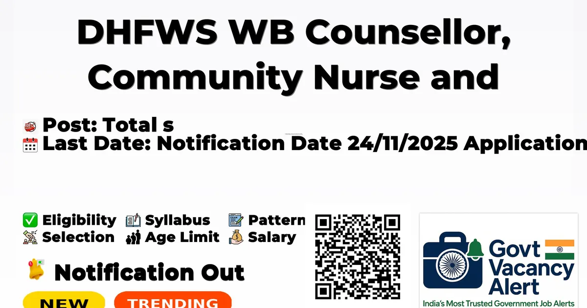 District Health and Family Welfare Samity (DHFWS WB) has released an official notification for the recruitment of 23 Counsellor, Community Nurse and More Posts. Interested and eligible candidates can apply Offline through the official DHFWS WB website. The last date to submit the application form is 09-12-2025. In this article, you’ll find the DHFWS WB Counsellor, Community Nurse and More Posts recruitment details, including eligibility criteria, age limit, salary structure, selection process, application steps, and direct links to the official notification and Offline application form.