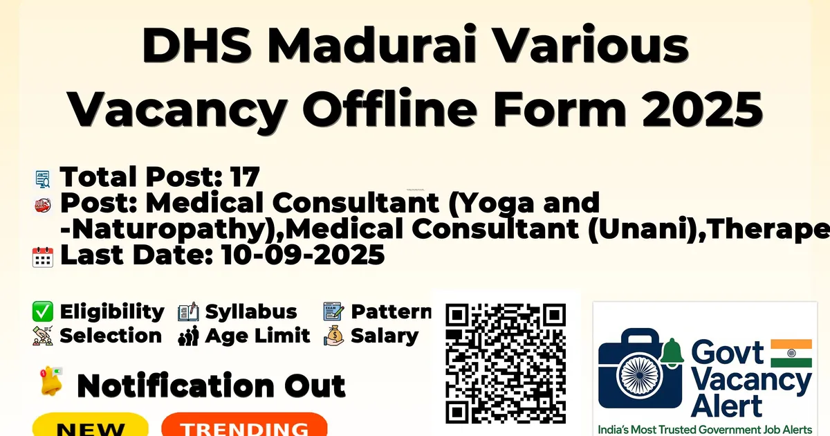 The District Health Society Madurai (DHS Madurai) Recruitment 2025 for 17 posts of Medical Consultant, Pharmacist and More. Candidates with Any Graduate, 8TH, BUMS, D.Pharm, DMLT Can Apply Offline. The Offline application opens on 29-08-2025, and closes on 10-09-2025. The candidate shall apply Offline through DHS Madurai website, madurai.nic.in. The DHS Madurai Medical Consultant, Pharmacist and More Recruitment 2025 Notification PDF has been released on 01-09-2025 at madurai.nic.in. Check the complete job details, vacancy, age limit, application fee, selection process and how to apply from the article. You can Check all Latest Sarkari Result Updates of All Central Government Jobs and State Government Jobs. DHS Madurai Medical Consultant, Pharmacist and More Recruitment 2025 Notification PDF