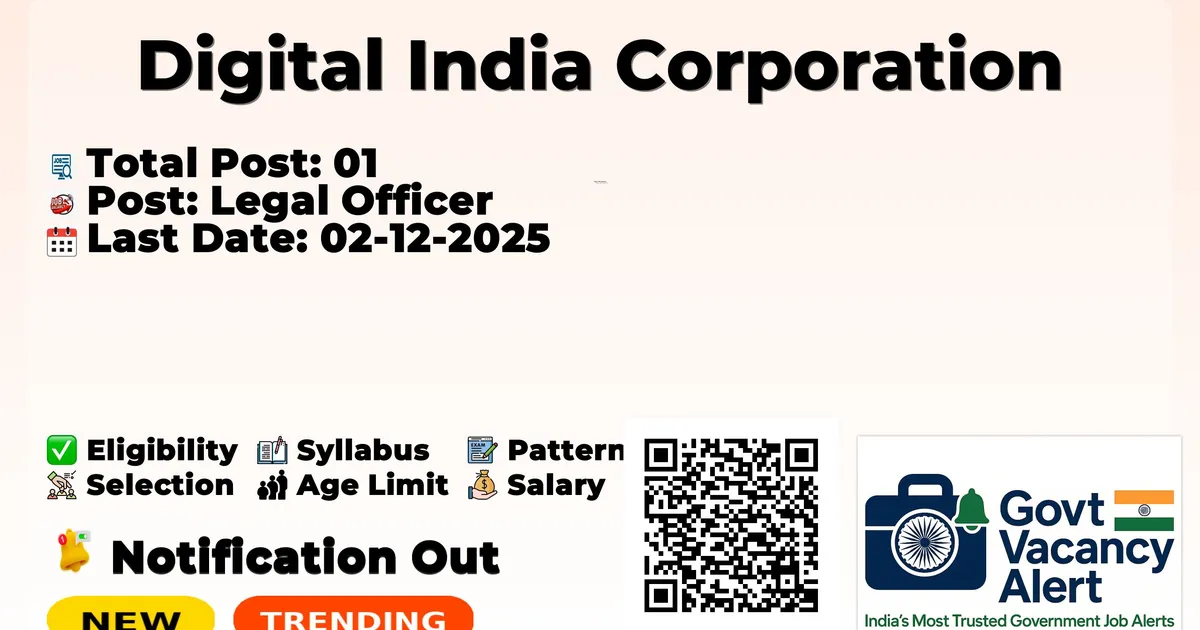Digital India Corporation has released an official notification for the recruitment of 01 Legal Officer Posts. Interested and eligible candidates can apply Online through the official Digital India Corporation website. The last date to submit the application form is 02-12-2025. In this article, you’ll find the Digital India Corporation Legal Officer Posts recruitment details, including eligibility criteria, age limit, salary structure, selection process, application steps, and direct links to the official notification and Online application form.