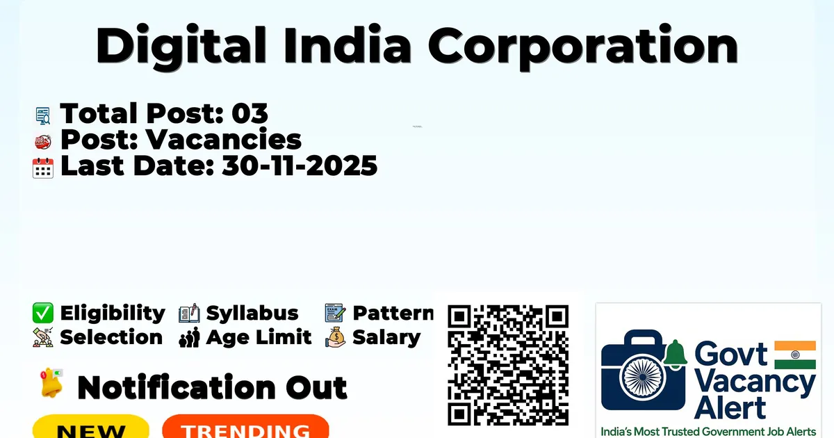 Digital India Corporation has released an official notification for the recruitment of 03 Manager, Data Analyst and More Posts. Interested and eligible candidates can apply Online through the official Digital India Corporation website. The last date to submit the application form is 30-11-2025. In this article, you’ll find the Digital India Corporation Manager, Data Analyst and More Posts recruitment details, including eligibility criteria, age limit, salary structure, selection process, application steps, and direct links to the official notification and Online application form.