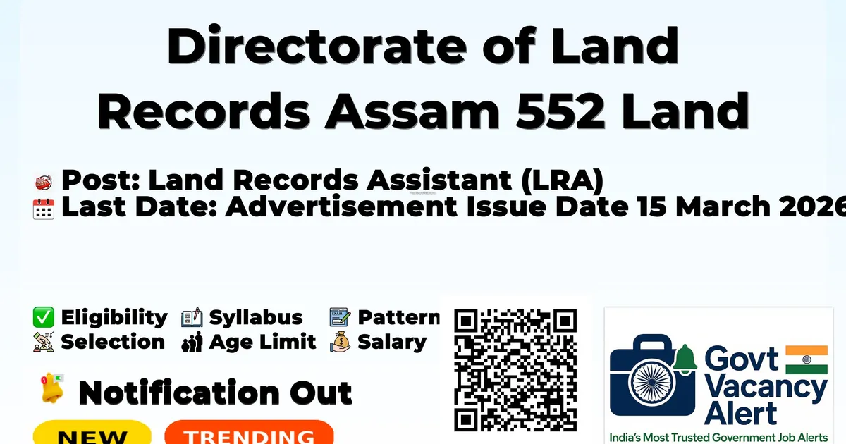 Directorate of Land Records & Surveys etc., Assam has released Advertisement No. DLR-11013(21)/50/2025/130 for recruitment to 552 Land Records Assistant (LRA) posts under the Assam Land Records Sub-Ordinate Service Rules (Amendment) 2025. Online applications are invited from candidates who have passed HSLC and successfully completed 6‑month Recorder’s Certificate Class Course (RCCC) Training from Assam Survey & Settlement Training Centre, Dakhingaon (except Sixth Schedule districts), with computer proficiency and Assamese/Bengali typing skills, through the SEBA online portal sebaonline.org from 15 March 2026 to 30 April 2026.