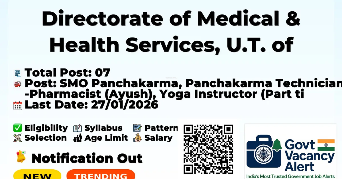Directorate of Medical & Health Services, U.T. of Dadra & Nagar Haveli and Daman & Diu (National AYUSH Mission DNH&DD) has announced a recruitment drive for 07 SMO Panchakarma, Panchakarma Technician, Pharmacist (Ayush) and Yoga Instructor (Part time – Female) positions for 2026, with offline applications invited from 13/01/2026 to 27/01/2026 via the official AYUSH Mission office (details on the official websites: ddd.gov.in). Eligibility requires qualifications such as BAMS MD (Panchakarma/Kayachikitsa), H.S.C. with Panchakarma Technician diploma/certificate, Bachelor of Pharmacy with Pharmacy Council registration, or Degree/Diploma/Graduation with Yoga certificate, with the upper age limit set between 35 and 45 years as of 01/01/2026 depending on the post. The selection process involves shortlisting of applications and an interview (no TA/DA admissible), and the maximum monthly financial assistance (salary) ranges from approximately ₹5,000/- for the part-time Yoga Instructor to ₹60,000/- for the SMO Panchakarma post.