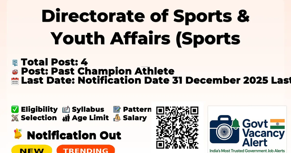Company Name Directorate of Sports & Youth Affairs (Sports Development Authority of Puducherry) (SDAP) Post Name Past Champion Athlete No of Posts 4 Salary Rs. 25,000 Per Month Qualification As per Eligibility Criteria for Past Champion Athlete Age Limit 40 years Last Date 23/01/2026 Official Website https://schooledn.py.gov.in/