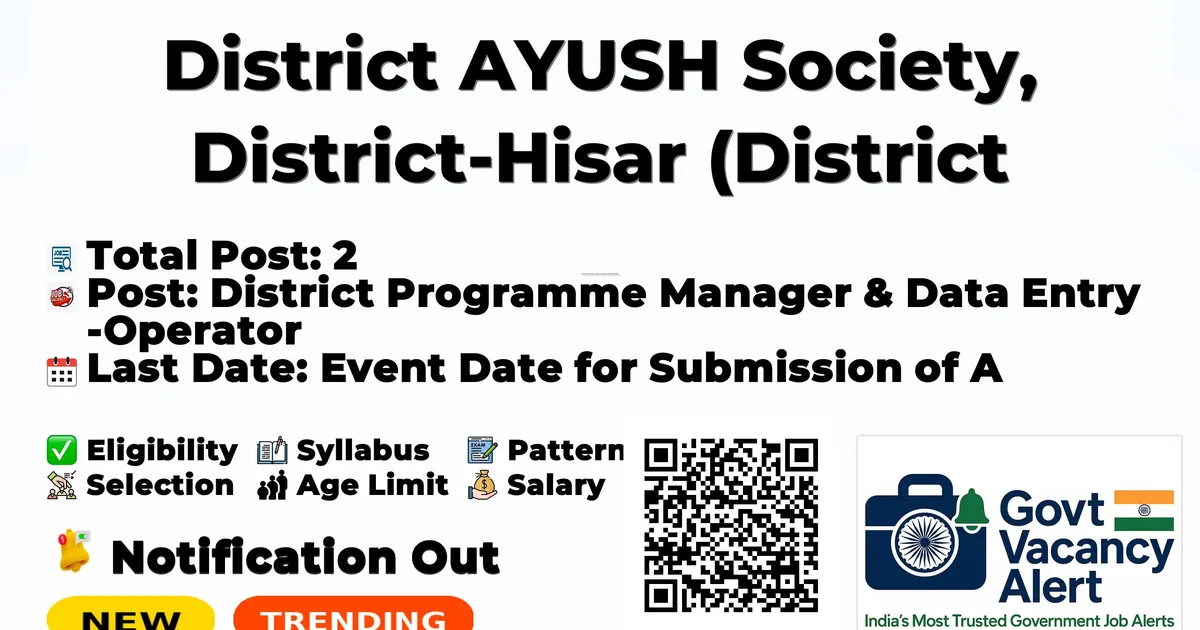 District AYUSH Society Hisar has released an official notification for the recruitment of 02 DEO, District Programme Manager Posts. Interested and eligible candidates can apply Offline through the official District AYUSH Society Hisar website. The last date to submit the application form is 02-03-2026. In this article, you’ll find the District AYUSH Society Hisar DEO, District Programme Manager Posts recruitment details, including eligibility criteria, age limit, salary structure, selection process, application steps, and direct links to the official notification and Offline application form. Advertisement Company Name District AYUSH Society, District-Hisar (District AYUSH Society Hisar) Post Name District Programme Manager & Data Entry Operator No of Posts 2 Advt No NAM/HSR/2026/418 Salary ₹38,500 (DPM) & ₹18,500 (DEO) Per Month Qualification Graduation with relevant experience (Post-specific) Last Date 02 March 2026 Official Website https://hisar.gov.in Trending Govt Jobs IAF Agniveer New Recruitment 2026 UPSC CSE Online Form 2026 DSSSB 911 AE, JE & More Online Form 2026 RRB 22000 Group D Online form 2026 MCL 677 Various Vacancies Online Form 2026 Name of Post No. of Post District Programme Manager (On Contract) 1 Data Entry Operator (On Contract) 1 Knowledge of Hindi or Sanskrit up to Matric Standard is compulsory for both posts. District Programme Manager: Graduation degree in any discipline including AYUSH and MBA in Healthcare Management / Masters in health/hospital administration / Post Graduation diploma in Hospital & healthcare management (Two years) from AICTE recognized institute with minimum 3 years working experience in Public health programme. Exposure in social sector schemes/missions at national, state and district level and computer knowledge including MS Office, MS Word, MS Power Point, MS Excel would be desirable. Preference will be given to persons having experience of working in Health sector including AYUSH. Data Entry Operator: Graduation in Computer Application/ IT/ Business Administration/ B.Tech (C.S) or (I.T)/ BCA/ BBA/ BSC - IT/ Graduation with one year diploma/ certificate course in computer science from recognized institute or University. Minimum 1 year of experience in government. Exposure in social sector schemes at National, State and District level and computer knowledge including MS Office, MS Word, MS Power Point and MS Excel, MS access would be essential. Typing Speed of English (30 WPM) and Hindi (25 WPM) would be essential. Preference will be given to persons who have experience of working in health sector including AYUSH. District Programme Manager: ₹38,500 Per Month Data Entry Operator: ₹18,500 Per Month Event Date Last Date for Submission of Application Form 02 March 2026 (up to 04:00 PM) Display of Eligible / Not Eligible List 10 March 2026 Type Test & Written Test 13 March 2026 at 10:00 AM Interview 17 March 2026 at 10:00 AM Maximum Marks of basic Educational qualification: 20 marks (20 × Percentage / 100) Additional regular Degree/Diploma related to basic Qualification: 5 marks (Degree = 5 marks, Diploma = 3 marks) Marks of work experience (over & above basic required experience): 10 marks (02 marks for each completed year) Written Test: 40 marks (Objective Type multiple choice questions - Mental ability & subject/post related) Basic Computer knowledge (MS Office, Tally etc.): 15 marks (15 multiple choice questions) Interview: 10 marks Total: 100 marks Type Test will be conducted for Data Entry Operator posts. One Application will be considered for one post only. Duly completed application with all supporting documents should reach by 02 March 2026 up to 4:00 PM by hand or registered post only. No application will be accepted after closing date & time. Knowledge of Hindi or Sanskrit up to Matric Standard is compulsory. Complete and accurate particulars along with Contact No., Email ID, Postal address with PIN CODE must be mentioned. Two Passport size photos and self-attested copies of Educational Qualification, Experience Certificate, and Domicile Certificate etc. should be attached. The Experience Certificate must be supported with a bank statement showing salary/Salary slip from the employer for the period of experience. Original documents in support of academic qualification and work experience shall be required at the time of interview. Only Job related Full Time Experience after completion of Job related qualification will be considered for post of DPM. Haryana Government Policies will be followed related to reservation and age. Applicant should provide valid proof in original for claiming benefit of reserved category at the time of Interview. The post is non-transferrable and the selected candidate will remain posted at the place of appointment on contract basis under NAM and service may be discontinued any time without offering any reason. No document will be accepted after submission of application form. No TA/DA will be paid to the candidates appearing in written examination/ interview. This office will not be responsible for any postal delay. Cell phones, Bluetooth, etc. electronic gadgets will not be allowed during Examination or Interview. Any sort of canvassing or influencing the officers related to selection and recruitment process would result in immediate disqualification of the candidate. Visit website https://hisar.gov.in for details of posts & download the application form. Application forms may also be collected from O/o District Ayurvedic Officer, 50 Bedded Integrated Hospital, Village Mayyar, Hisar -125001. Fill the application form completely and attach all required self-attested documents and two passport size photographs. Submit the duly filled application form in the office of District Ayurvedic Officer, 50 Bedded Integrated Hospital, Village Mayyar, Hisar-125001 by hand or by registered post only on or before 02 March 2026 up to 04:00 PM. No application will be accepted after the last date & time. Official
