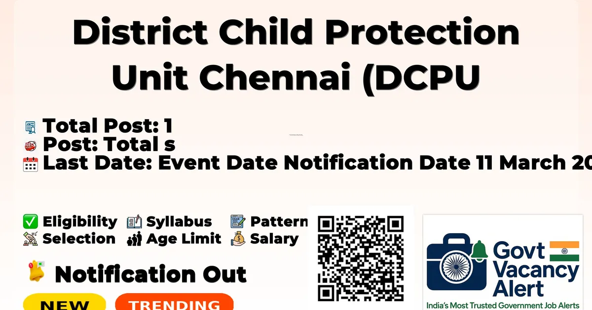 District Child Protection Unit Chennai (DCPU Chennai) has officially announced a Offline for the recruitment of 1 Accountant Posts. This offers a great opportunity for candidates looking for government jobs. Candidates with B.Com or equivalent, Computer knowledge with Tally, 1 year Accounts experience qualification can directly attend the interview on 23 March 2026