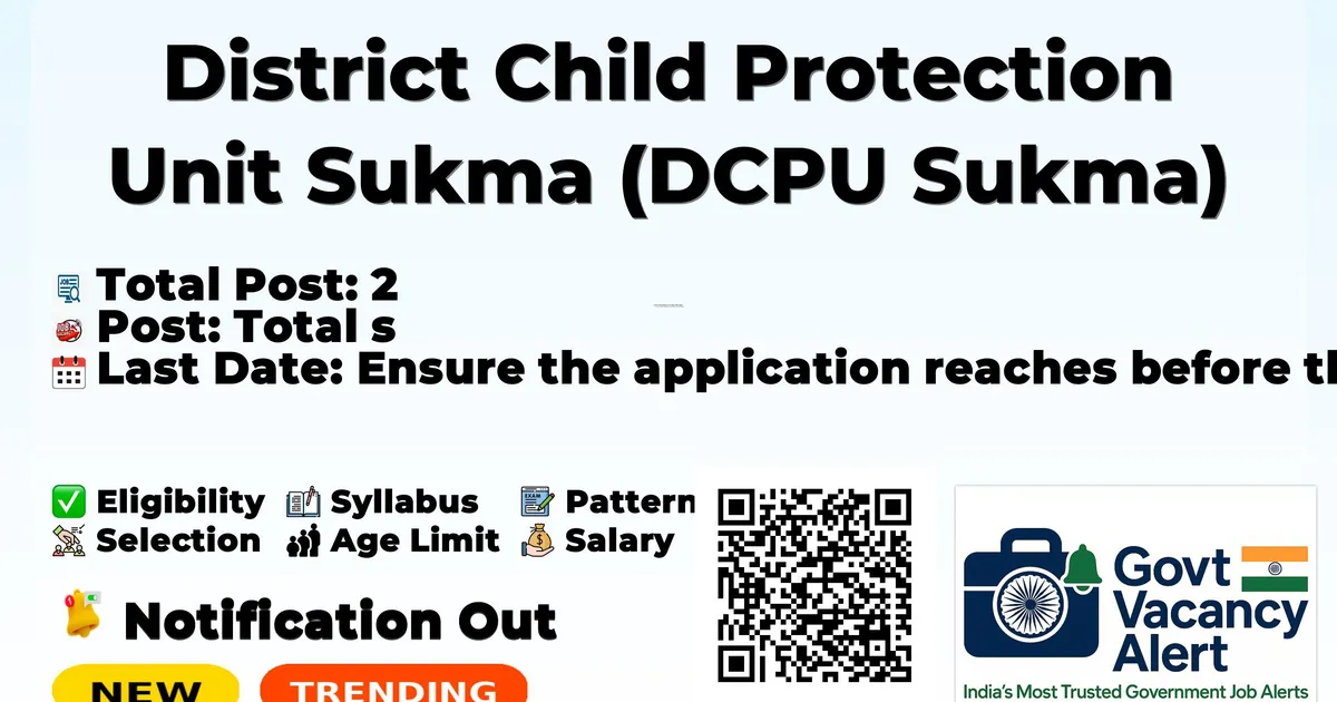 District Child Protection Unit Sukma (DCPU Sukma) has officially released a notification for the recruitment of 2 Counsellor, Social Worker Posts. This recruitment drive offers a great opportunity for candidates looking for government jobs. Interested and eligible candidates can download the application form from the official website and submit it offline. The offline application process is open until 18-03-2026, and candidates are advised to send their completed applications well before the deadline. Advertisement Company Name District Child Protection Unit Sukma (DCPU Sukma) Post Name Counsellor, Social Worker No of Posts 2 Salary Rs. Rs. 18,536/- Per Month Qualification Graduation in relevant fields (Social Work/Sociology/Psychology/Social Sciences) Age Limit Min: 21 years, Max: 35 years Last Date 18-03-2026 Apply Mode Offline Job Type Contractual Trending Govt Jobs RRB 22000 Group D Online form 2026 IAF Agniveer New Recruitment 2026 DSSSB 911 AE, JE & More Online Form 2026 MCL 677 Various Vacancies Online Form 2026 MMRDA 235 AE, JE and More Posts Online Form 2026 Candidates should download and read the DCPU Sukma Jobs 2026 notification PDF carefully to check vacancy details, eligibility, age limit, and application instructions. The notification also includes important dates and selection process details. The direct download link is available in the Important Links section below. Download DCPU Sukma Job 2026 Notification PDF Post Name Total Posts Counsellor 1 Social Worker 1 Total 2 Counsellor: Graduation in Social Work / Sociology / Psychology / Public Health / Work-sology from a recognized university + PG Diploma in Work-sology and Communication. Minimum 1 year of experience in Women and Child Development with Govt/NGO. Proficiency in MS Office/computer/web software. Desirable: Knowledge of English and Hindi. Social Worker: Graduation in Social Work / Sociology / Social Sciences from a recognized university. Preferably 1 year of experience in women/child welfare with Govt/non-govt. Proficiency in MS Office/computer/web software. Desirable: Knowledge of English and Hindi. Minimum Age: 21 years Maximum Age: 35 years Age Relaxation: As per Chhattisgarh Government rules by General Administration Department; maximum age including relaxations not exceed 45 years. Rs. Rs. 18,536/- Per Month Event Date Notification Date 03 February 2026 Last Date for Application 18 March 2026 Screening of applications Preparation of merit list based on academic marks (70% weightage) + experience marks (max 10 marks) Shortlisting in 1:10 ratio for interview Personal Interview (20 marks) Final merit list and waiting list Document verification Candidates who wish to apply for DCPU Sukma Various Posts Recruitment 2026 through offline mode should follow the steps below. Read the official notification carefully before applying. Download the application form from the official website: https://sukma.gov.in/. Fill the application form carefully with correct information. Attach self-attested copies of required documents such as photograph, signature, ID proof, and certificates. Check all details carefully before submission. Send the completed application form to the address mentioned in the notification through Speed Post / Registered Post or as instructed. Ensure the application reaches before the last date: 18-03-2026. Keep a photocopy of the submitted application form for future reference. Link Description Link Official Notification PDF Click here Official Website Click here