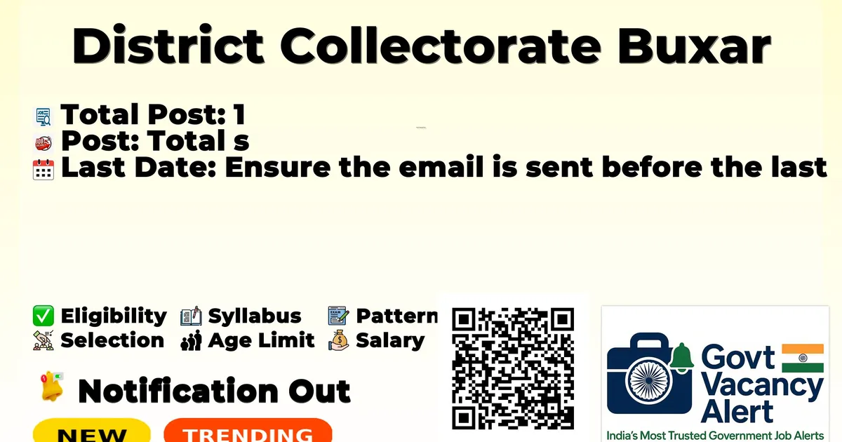 Company Name District Collectorate Buxar Post Name District Project Officer No of Posts 1 No 01/2025-26 Salary Rs. 36000/- + 2500/- (Establishment) + 2000/- (TA/DA) + 500/-(Mobile and Communication Charges) per month Qualification Graduation degree in any discipline from a recognized University. Age Limit Maximum age limit 35 years as on 31.01.2026 Last Date 31-03-2026 Apply Mode Email Job Type Contract