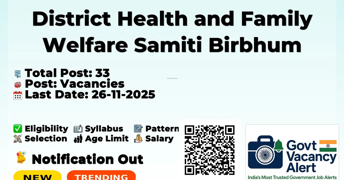 District Health and Family Welfare Samiti Birbhum (DHFWS Birbhum) has released an official notification for the recruitment of 33 CHO, Staff Nurse and More Posts. Interested and eligible candidates can apply Online through the official DHFWS Birbhum website. The last date to submit the application form is 26-11-2025. In this article, you’ll find the DHFWS Birbhum CHO, Staff Nurse and More Posts recruitment details, including eligibility criteria, age limit, salary structure, selection process, application steps, and direct links to the official notification and Online application form.