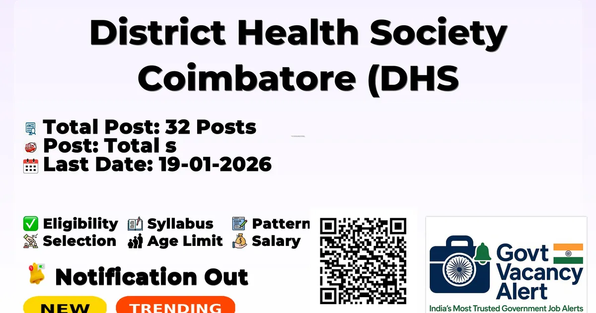 District Health Society Coimbatore (DHS Coimbatore) has released an official notification for the recruitment of 32 Cleaner, Support Staff and Other Posts. Interested and eligible candidates can apply Offline through the official DHS Coimbatore website. The last date to submit the application form is 19-01-2026. In this article, you’ll find the DHS Coimbatore Cleaner, Support Staff and Other Posts recruitment details, including eligibility criteria, age limit, salary structure, selection process, application steps, and direct links to the official notification and Offline application form.