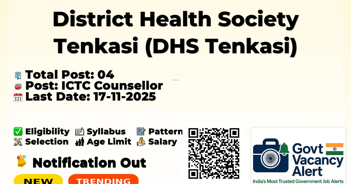 District Health Society Tenkasi (DHS Tenkasi) has released an official notification for the recruitment of 04 ICTC Counsellor Posts. Interested and eligible candidates can apply Offline through the official DHS Tenkasi website. The last date to submit the application form is 17-11-2025. In this article, you’ll find the DHS Tenkasi ICTC Counsellor Posts recruitment details, including eligibility criteria, age limit, salary structure, selection process, application steps, and direct links to the official notification and Offline application form.