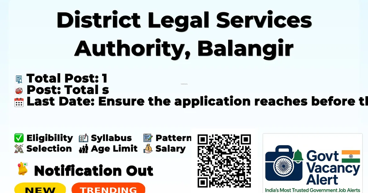 District Legal Services Authority Balangir (DLSA Balangir) has released an official notification for the recruitment of 01 Assistant Posts. Interested and eligible candidates can apply Offline through the official DLSA Balangir website. The last date to submit the application form is 26-02-2026. In this article, you’ll find the DLSA Balangir Assistant Posts recruitment details, including eligibility criteria, age limit, salary structure, selection process, application steps, and direct links to the official notification and Offline application form.